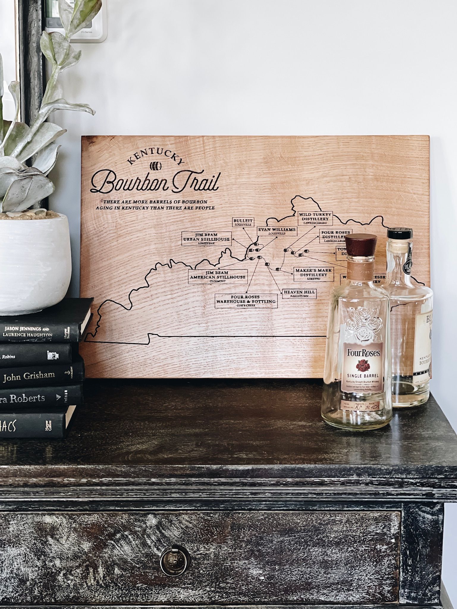 Among Grainwell’s selection of barrel heads, one of the most popular designs is the Bourbons of Kentucky Bourbon Barrel Head ($140), featuring silhouettes of brands including Four Roses, Blanton’s, and Buffalo Trace, among others. The barrel heads are made in the Covington woodshop of this women-owned and -operated business. You might also like the Kentucky Bourbon Trail Hard Wood Sign (from $68).